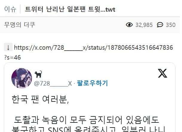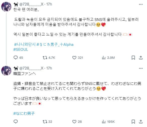 然而,有一位日本粉絲在社群媒體X上用韓文發表了一則具嘲諷意味的貼文,引發爭議。該粉絲寫道:「韓國的粉絲們,明明禁止偷拍和錄音,但還是把內容上傳到SNS,真是辛苦了,還特地讓『浪花男子』不喜歡你們,謝謝了。也謝謝你們製造出讓他們更加喜歡日本的契機。」