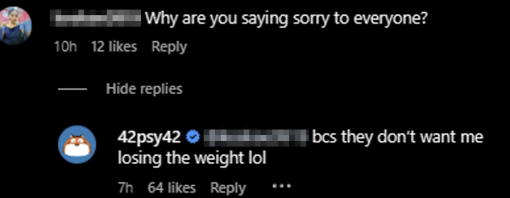 這些粉絲以幽默的方式回應表示:「哇,他又開始不好好照顧自己了。這是不可接受的。」、「這不是 PSY。」、「PSY,如果你連體重都維持不了,你怎麼能稱自己為名人?」、「你現在不打算維持身材了嗎?」、「你又沒有維持體重了。」以及「PSY怎麼瘦這麼多?這是AI生成的圖像嗎?」等等