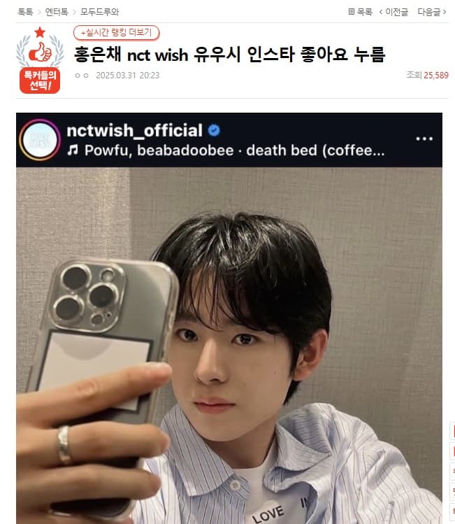 SM娛樂旗下男團「NCT Wish」在其官方Instagram帳號於31日公開了20歲「得能勇志」的照片。LE SSERAFIM成員「洪恩採」似乎給這張照片點了讚。眼尖的K-POP粉絲已截圖記錄了這個瞬間。(也有聲音稱這是合成圖片。)