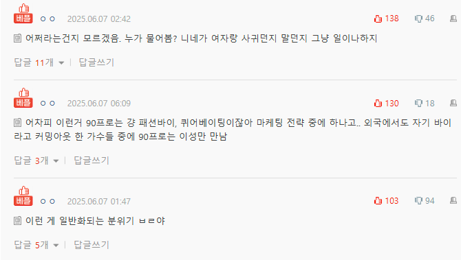 「老實說,90% 這類的東西都只是穿搭雙性戀或 queerbaiting(釣同志)。根本就是他們的行銷手法……就算是在國外,那些出櫃說自己是雙性戀的藝人,90% 最後也只跟異性交往。」