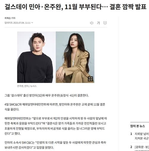 7月4日韓國時間,珉雅所屬經紀公司SM C\&C發布官方聲明宣布喜訊:「懇請大家給予即將踏入人生新階段的兩位溫暖的支持與祝福。SM C\&C也獻上最誠摯的祝賀。」,並向多家媒體轉達此消息。