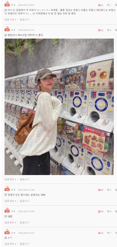 雖然照片未經修飾且氛圍隨意,但許多網友仍驚訝於她肌膚的完美無瑕,甚至在看似自然光線下依然如此。該貼文獲得數百個讚和數十則留言,許多網友在評論中表達對員瑛素顏的驚嘆,有人讚美她清透的膚質,也有人對她整體的外貌感到震撼。