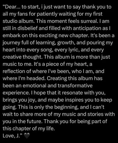 “親愛的…首先,我只想感謝所有粉絲耐心等候我的首張錄音室專輯。這一刻感覺不真實。當我踏入這令人興奮的新篇章時,心中仍滿是難以置信與期待。這一路充滿學習、成長,還有把我的心傾注在每一首歌、每一句歌詞、每一個創意念頭裡。對我而言,這張專輯不只是音樂。它是我心的一部分,是我走過的路、我是誰、以及我要前往何處的倒影。創作這張專輯是一段充滿情感、並帶來改變的旅程。我希望它能與你共鳴、帶給你喜悅,或許也能鼓勵你繼續前行。這僅僅是開始,我已迫不及待想在未來與你分享更多音樂與故事。感謝你成為我人生這一章的一部分。