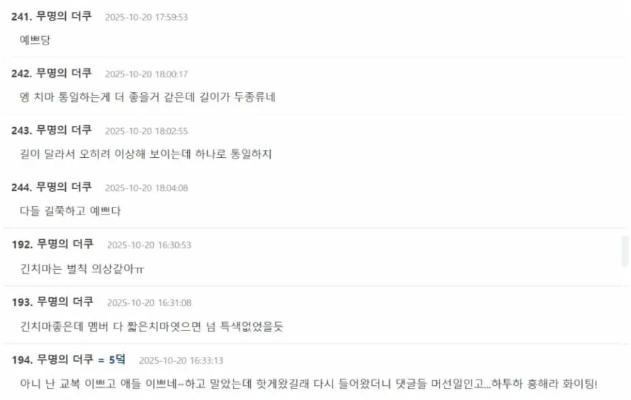 尤其是那三位穿較長裙子的成員,引發了不同反應。她們的裙子皺巴巴的,而且彼此也不太相配。