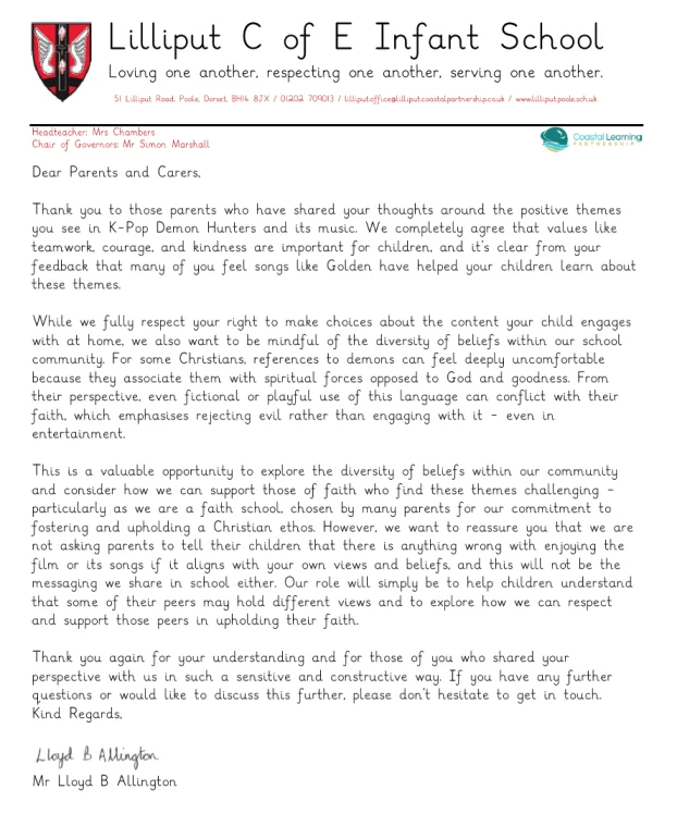 校方一開始曾請求家長「不要讓孩子在學校唱這些歌,作為對那些覺得這不符合其信仰之人的一種體諒」。並說明,所謂「惡魔」是「與上帝對立的靈性存在」,因此這樣的措施是為了守護基督徒的價值觀。