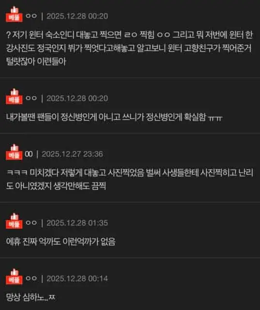 「?那地方根本就是Winter宿舍附近啊。要是有人那麼明目張膽在那裡幫她拍照,百分之百會被抓包吧(笑)。而且之前不是也有人說Winter在漢江拍的照片是柾國或 V 拍的,結果後來證實其實是她的家鄉朋友拍的嗎?你們這些蠢貨。」