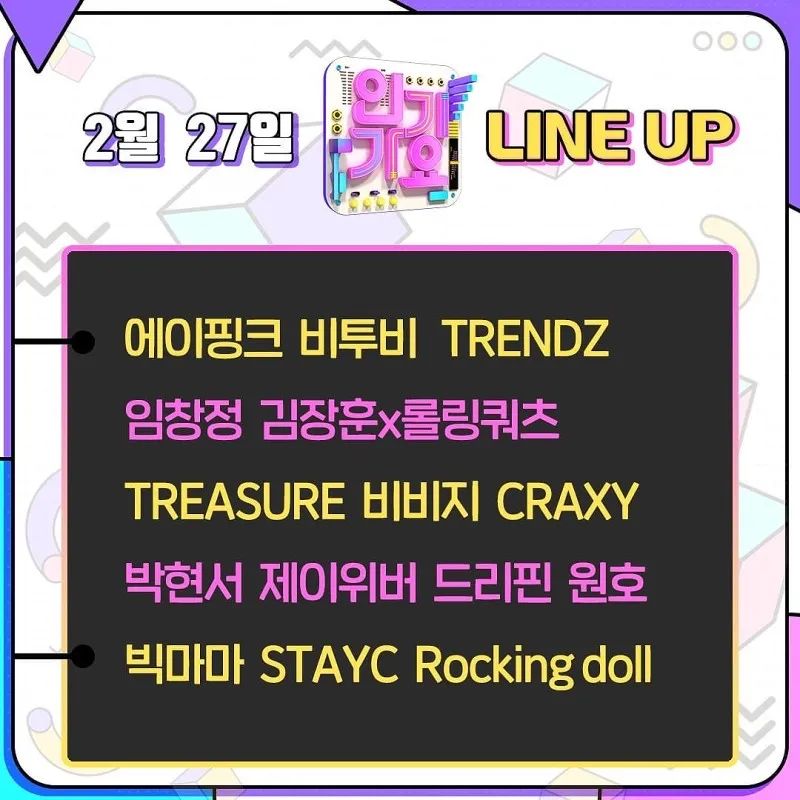 2月最後一個音樂節目,本週SBS《人氣歌謠》的出演陣容有BTOB、TREASURE、Apink、VIVIZ、STAYC、元虎等15組藝人。