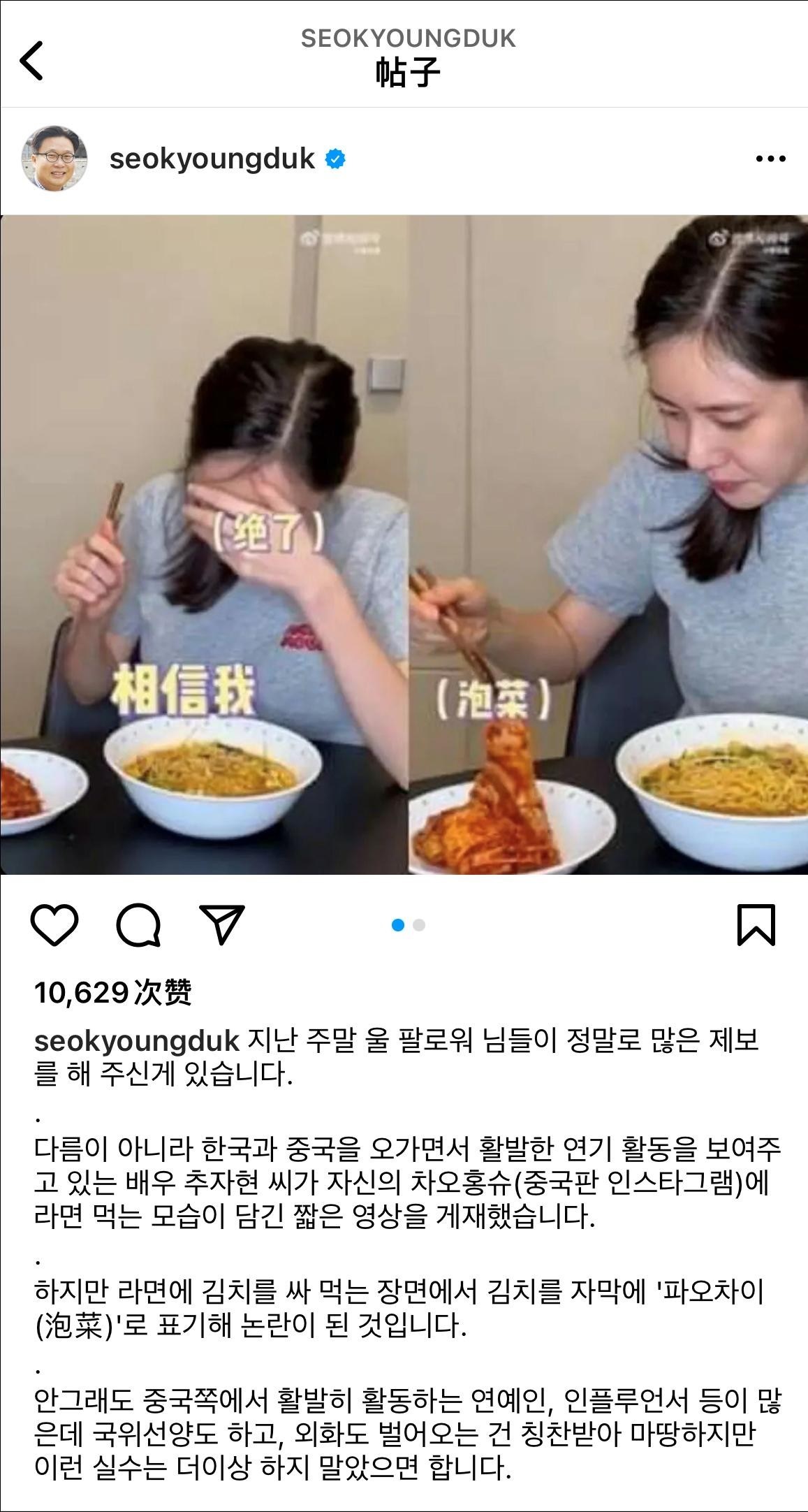 最近,秋瓷炫因為在中國SNS(小紅書)上傳的一段影片中,將“김치(辣白菜)”標記為“泡菜”而引發了爭議,甚至遭到了誠信女子大學客座教授徐敬德的指責。
