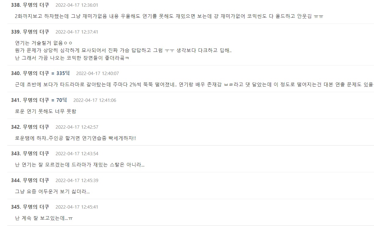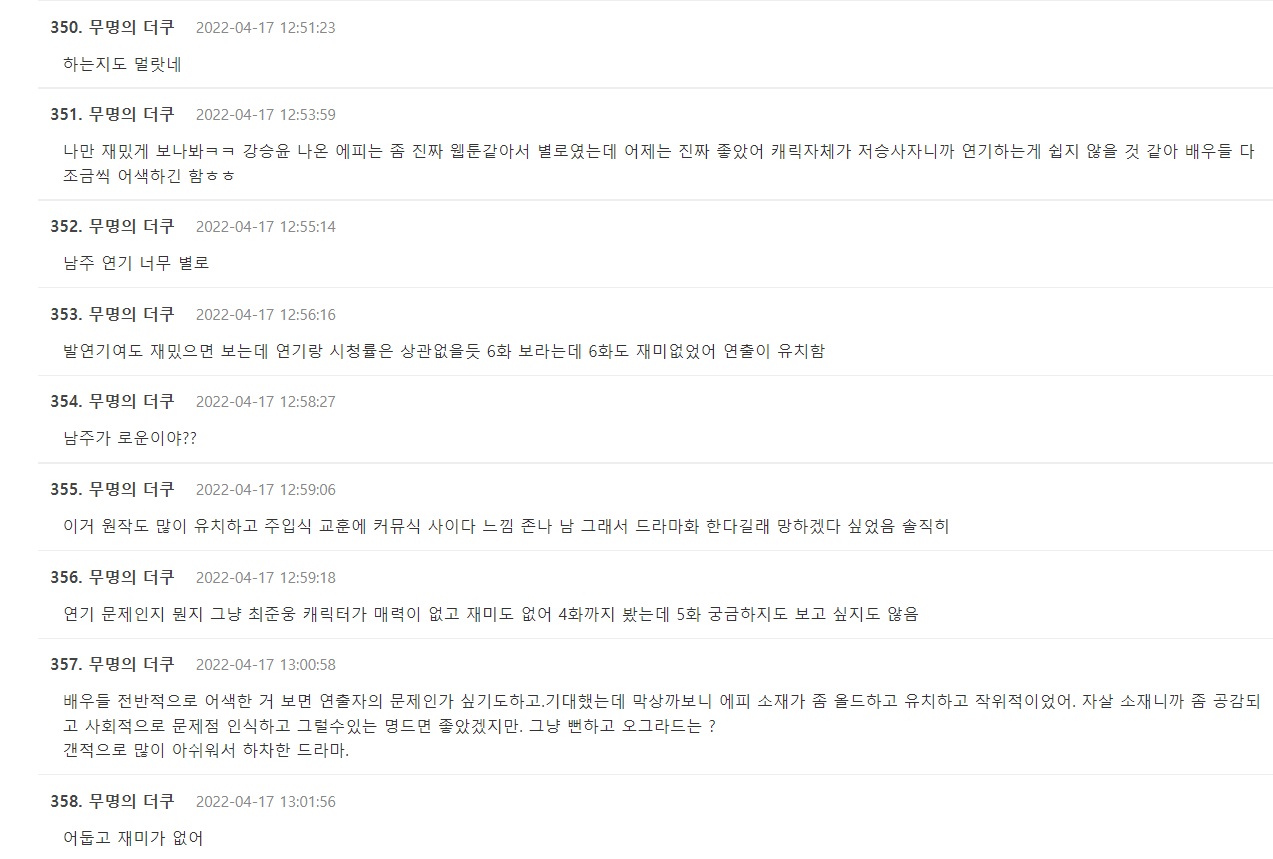 不少韓國網友留言表示:“能說演員們的表演太尷尬了嗎”、“它沒有我想像中那麼有趣”、“看了一會兒,就被糟糕的CG特效勸退”、“主角群單獨看演技還不錯,但是搭在一起太尷尬了”、“不管是不是演技問題,毫無性格魅力的角色形象讓我放棄了”、“不光是表演的問題,導演和編劇在劇情把控上也有很大的問題”等等。