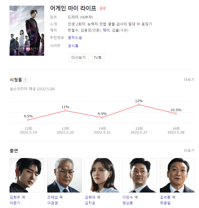 第二名:《再次我的人生Again My Life》,最高收視率12%。