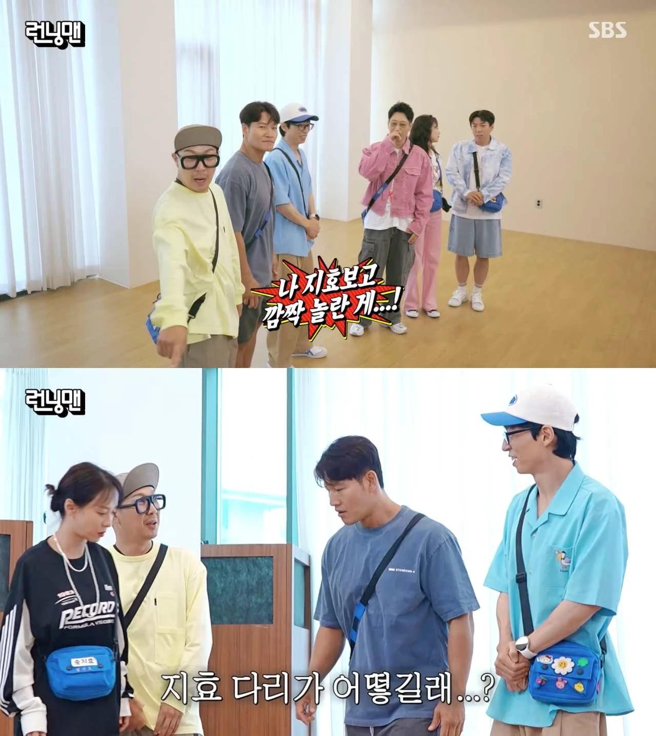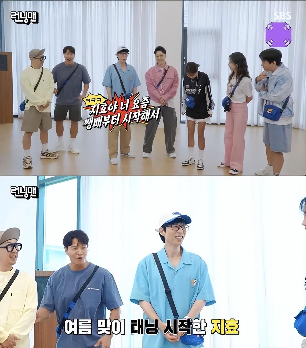 看到宋智孝美黑後的腿,《Running Man》的成員們都驚呆了,宋智孝以非常規的時尚舉動讓成員們大吃一驚。