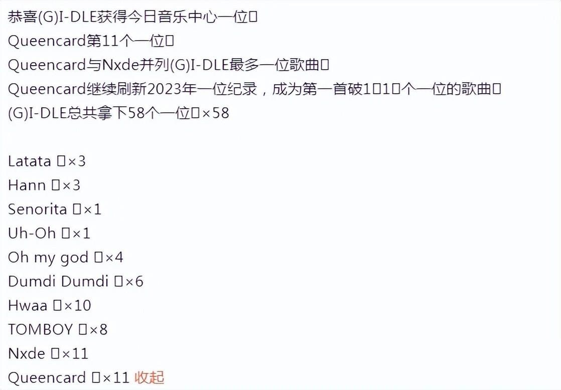 (G)I-DLE在發歌一個月之後的今天,新曲《Queencard》再度拿到了打歌一位,也就是在昨天的《音樂中心》上,而且這還是韓流三大打歌節目之一,至此該曲已經拿到了11個打歌一位,這是韓流樂壇2023年拿到打歌一位最多的音樂作品,也是唯一打歌一位數量達到兩位數的歌曲,而且這還是(G)I-DLE的自作曲。