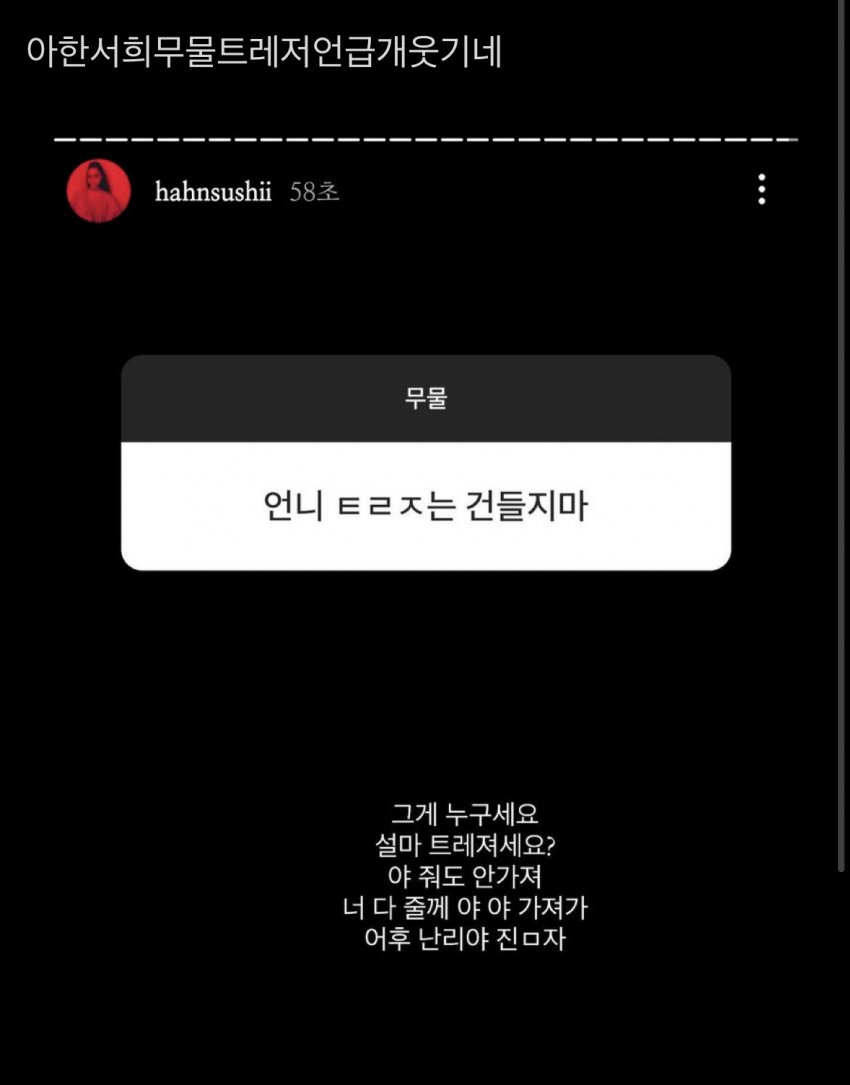 其中,有位Treasure的粉絲留言:「姐姐,別碰ㅌㄹㅈ。」對此,韓瑞希回應說:「那是誰啊?難道是Treasure嗎?啊~,即使給我我也不會要。全部給你吧,你拿走。真是的,大驚小怪的。」